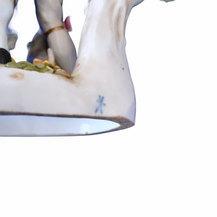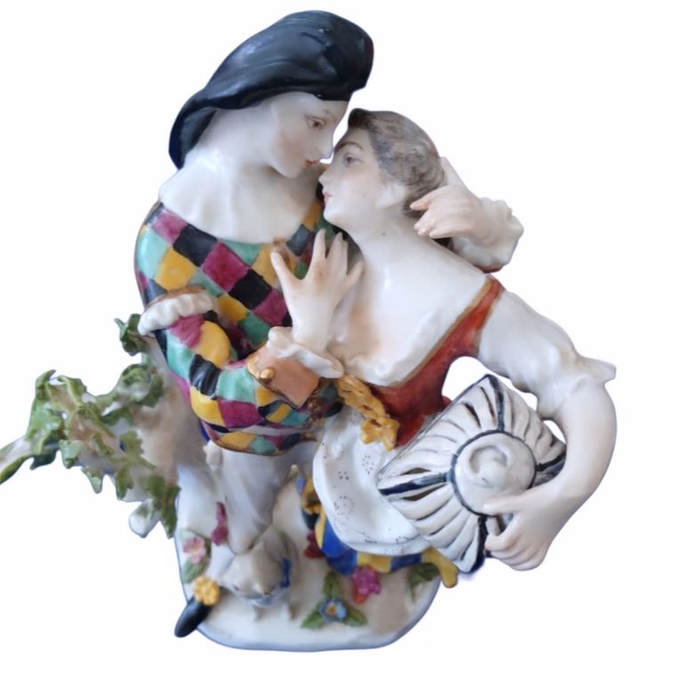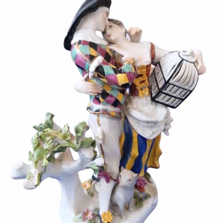 Escultura em porcelana da Alemanha representando cena romântica; personagens com roupas em aspecto circense, em tons diversos, base adornada com flores e folhagens.