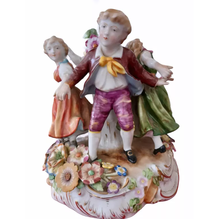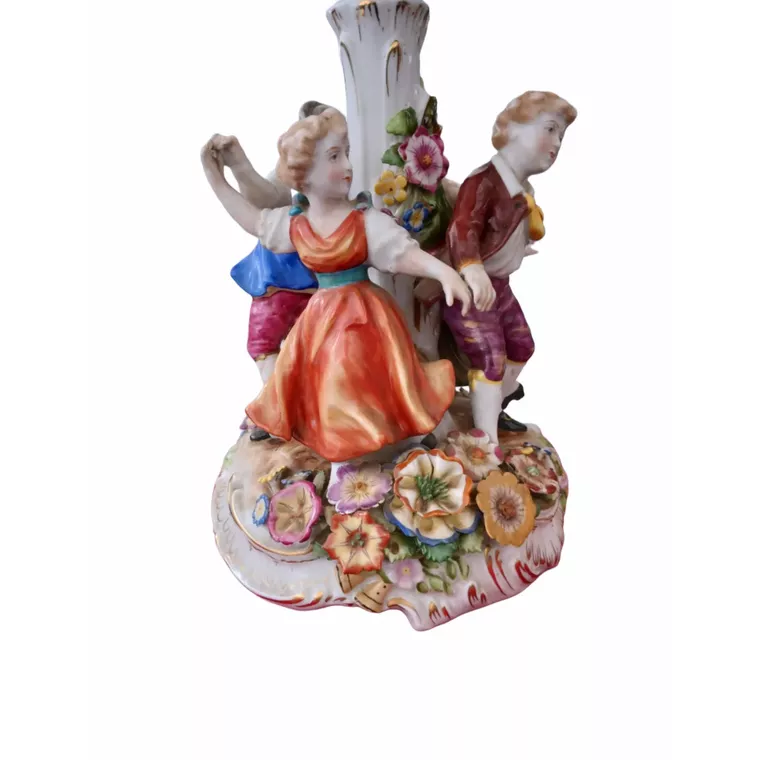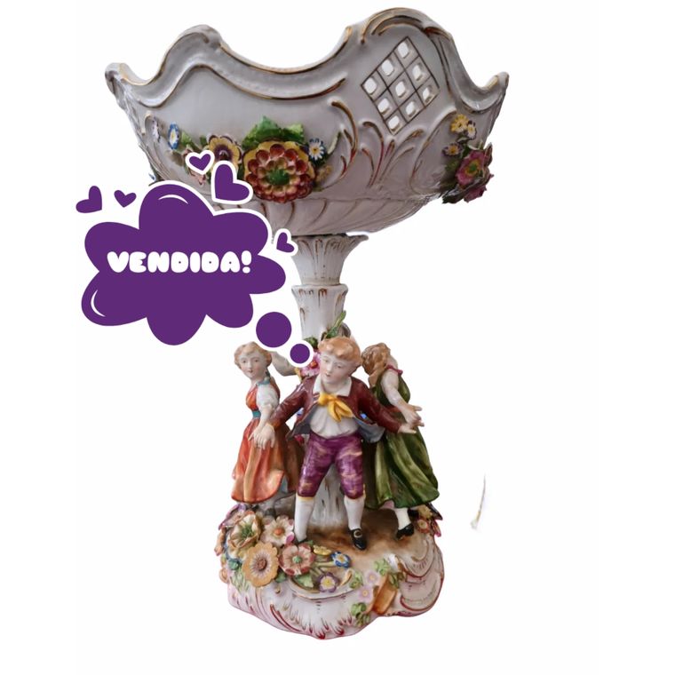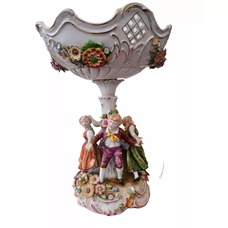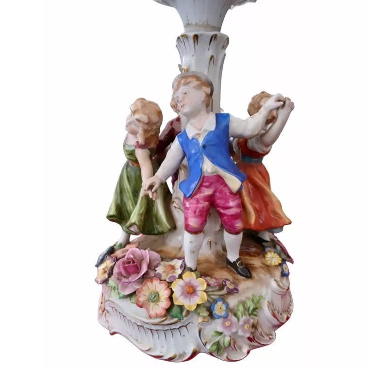 Excepcional fruteira em porcelana alemã da marca "Von Schierholz" com crianças na base brincando de roda, em trajes de época; rica aplicação de flores em relevo, tanto na base, quanto na fruteira. Período: século XIX.