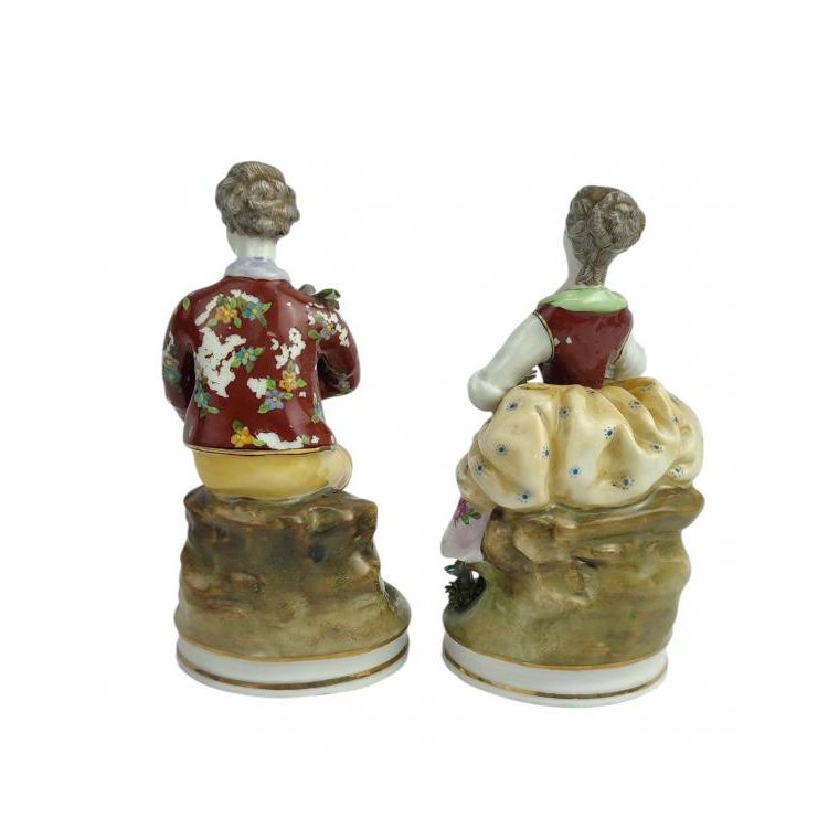 Par com figura masculina e feminina em porcelana esmaltada e vitrificada, Europa, marca na base. A roupa do rapaz, apenas na parte de trás, apresenta discreto desgaste.