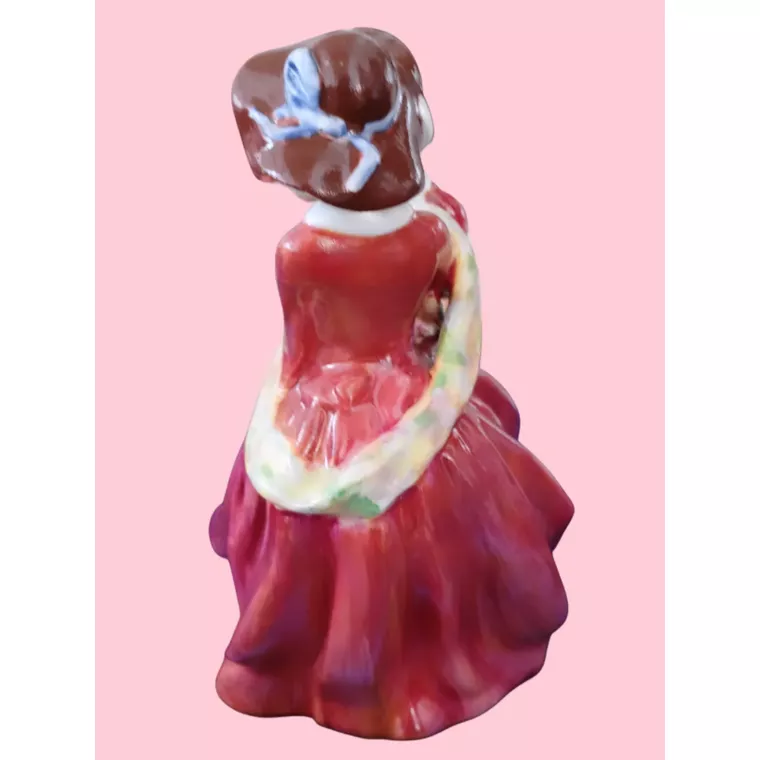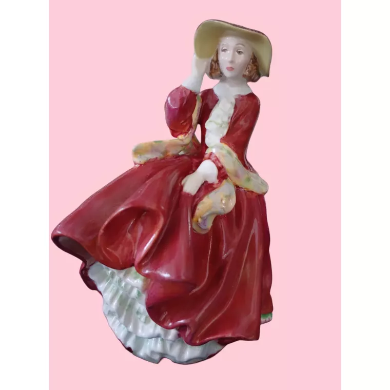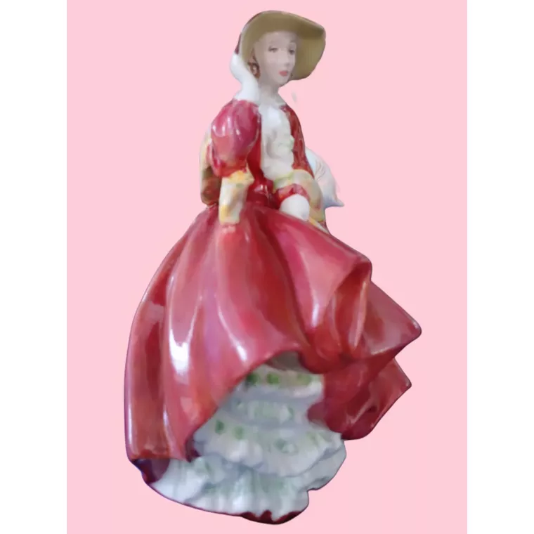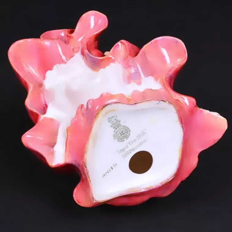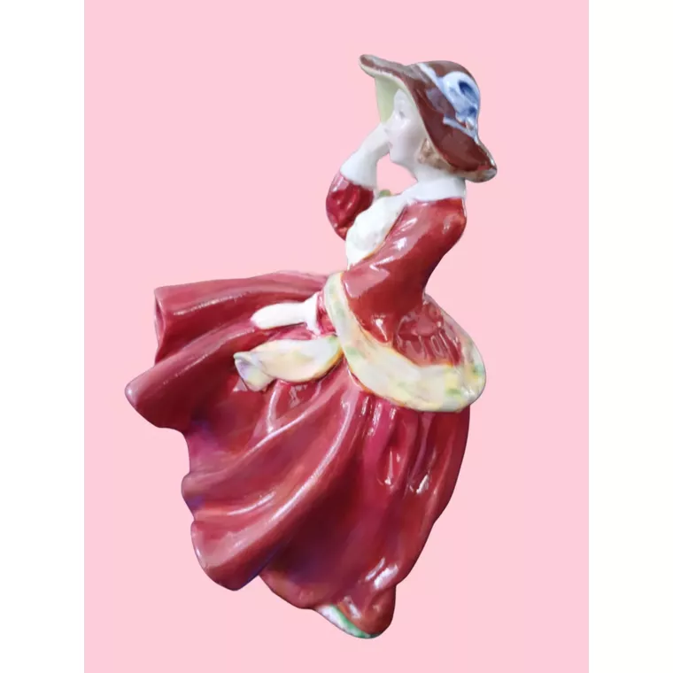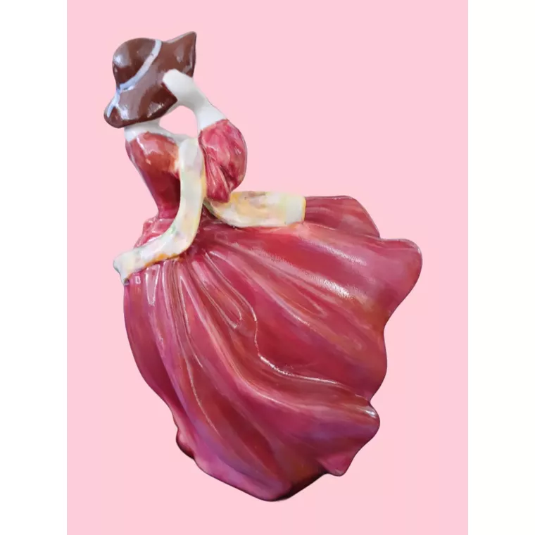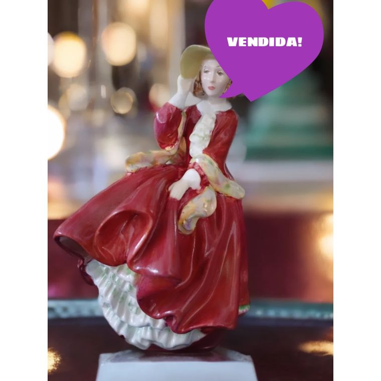 Figura feminina da marca inglesa Royal Doulton, em porcelana esmaltada e vitrificada, nas tonalidades rosa, azul e verde. A dama está no topo de uma colina, sob o vento, segurando o chapéu que o vento tenta levar. O título da peça é "Topo da colina".