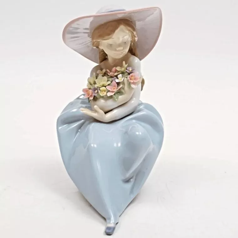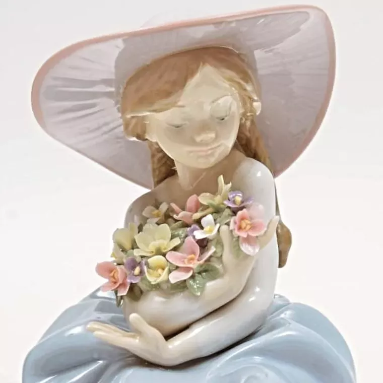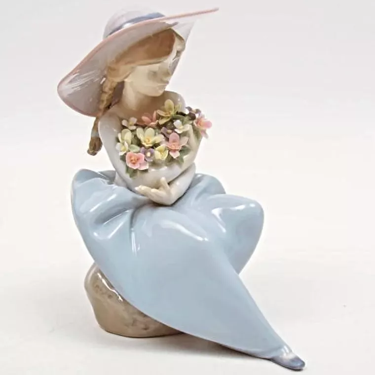 LLADRÓ - Elegante estatueta moldada em porcelana da marca Lladró, representando menina com buque de flores. Marcada e com numeraçao 2285, entitulada "Fragant bouquet", designer Antônio Ramos. Cores em tom pastel, típicas da marca: azul, branco, bege, marrom, amarelo, rosa e verde.