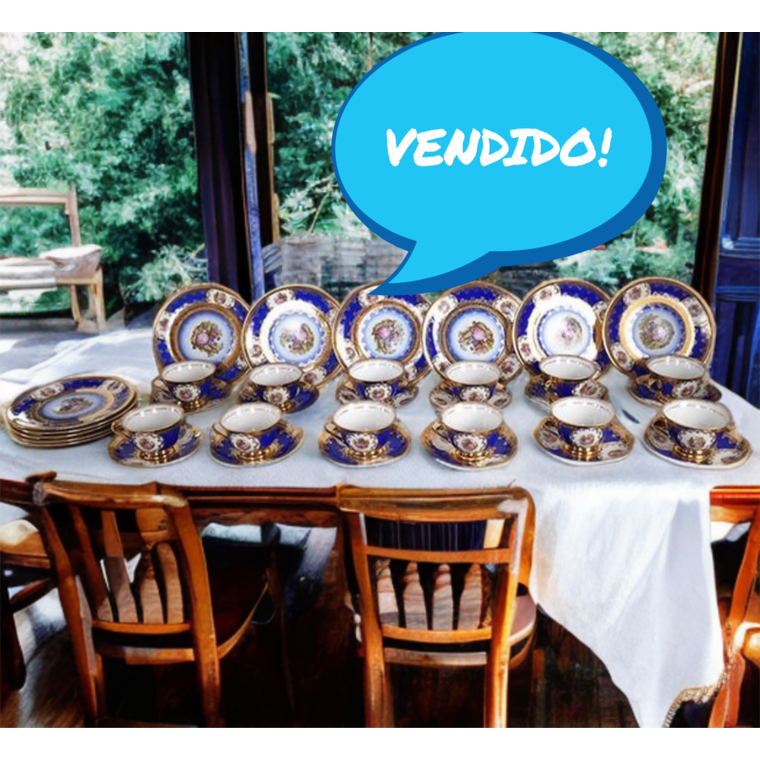 Belíssimo jogo para chá de porcelana, esmaltada e vitrificada, fundo azul royal com detalhada pintura em tonalidades diversas, representando cenas idílicas. Jogo para oito pessoas, contendo oito xícaras de chá com pires e oito pratos de sobremesa selo LUIS XV sob a base.
