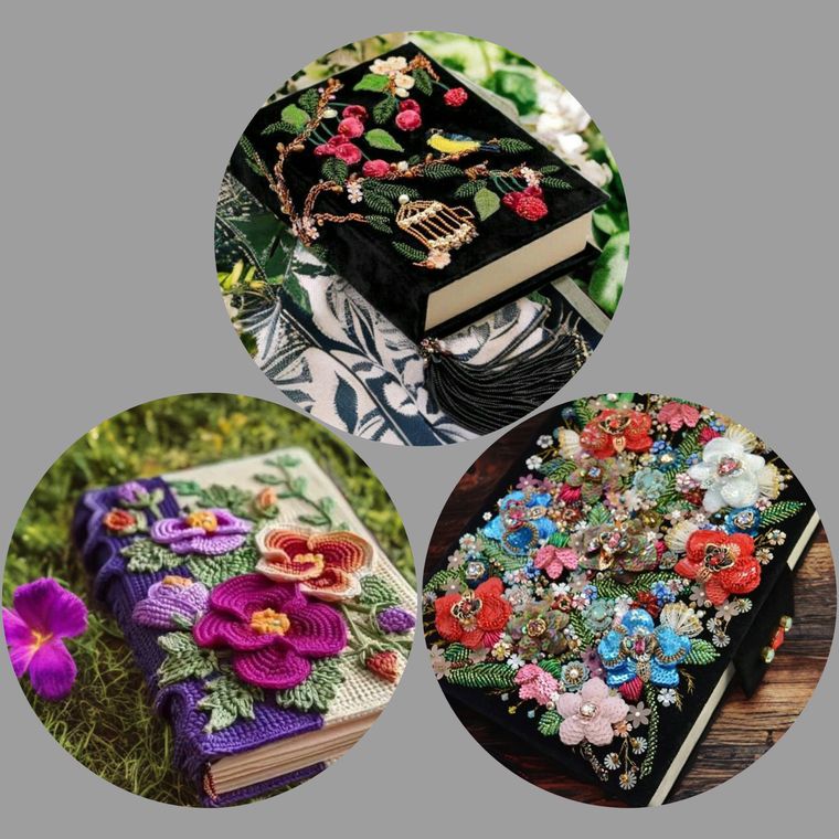 Em relação à capa do seu livro, temos várias possibilidades de escolha, feitas por artistas de seu ofício: capa totalmente única criada com origami, pintura em aquarela, gravura, design com enfeites lindos criados em papel, bordado simples, bordado com pedras, crochê, capa feita com botões lindos, capa feita com pedras e bijuterias vintage, capa trabalhada com esculturas em metal, capa revestida em seda, organza ou tule.