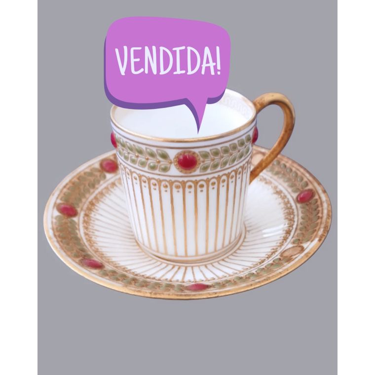 LIMOGES - Delicada xícara para café de coleção confeccionada em porcelana francesa do século XIX pintada a mão com apliques de esmalte e riquíssima douração e pintura. Peça marcada na base.